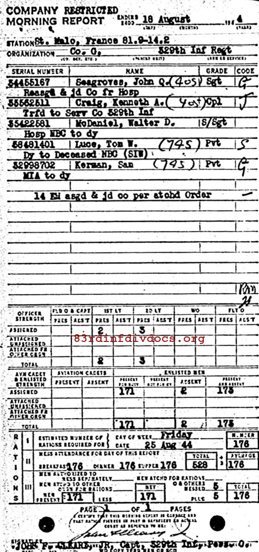 | Private Luce was a member of G Company. The morning report for August 18, 1944 on page 25 lists him as non battle casualty due to self inflicted wounds. The page can be seen below. |