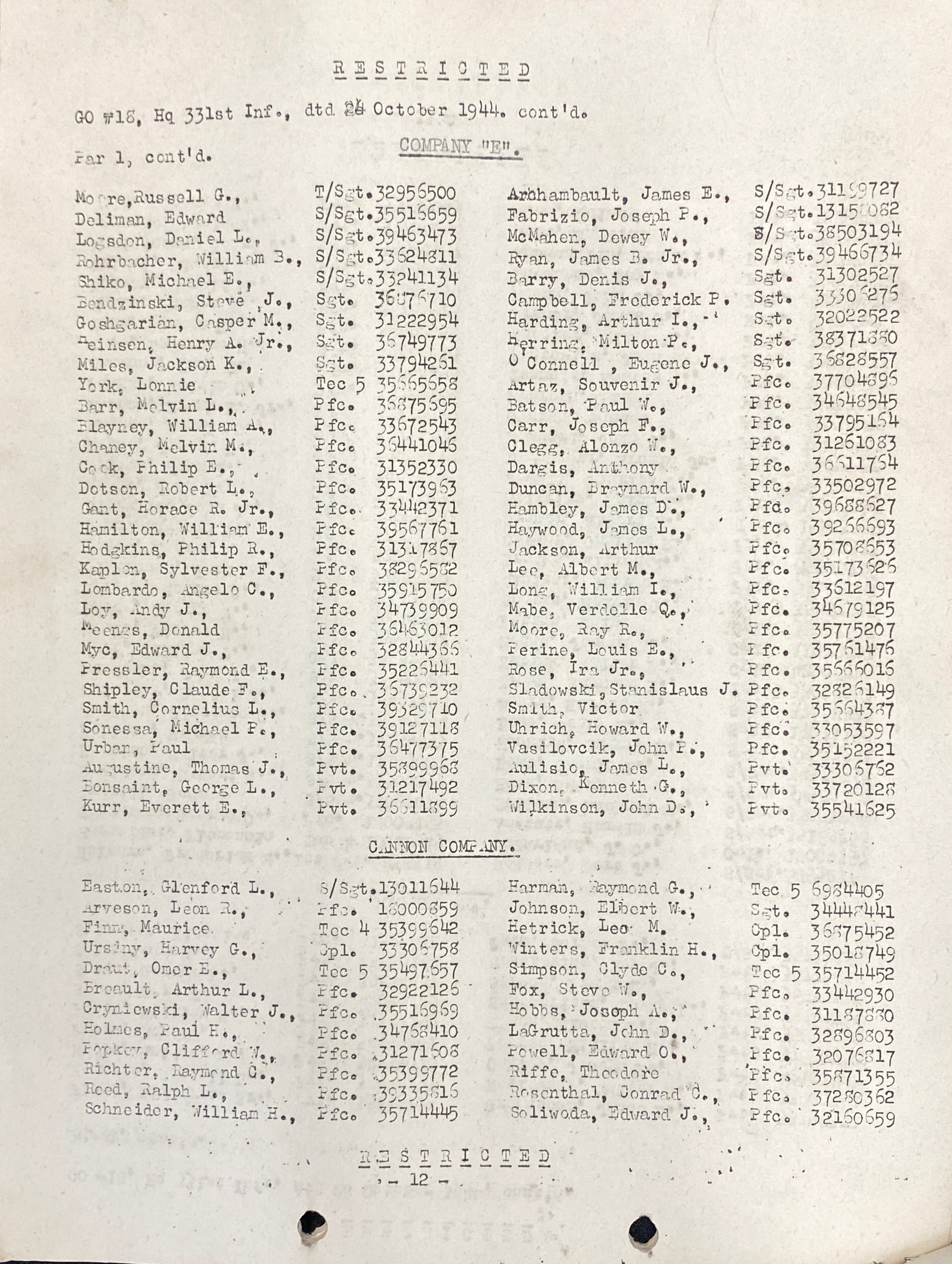 | 1944-07-30 | PVT | Promoted to Sergeant, duty changed to Squad Leader (653) as of July 17, 1944 | E / 331 | view page | |
