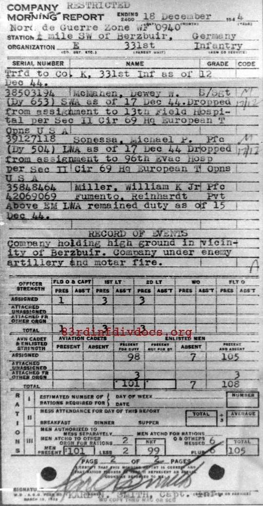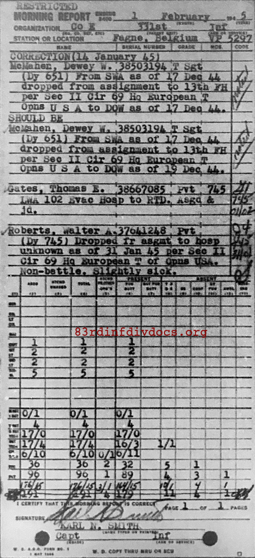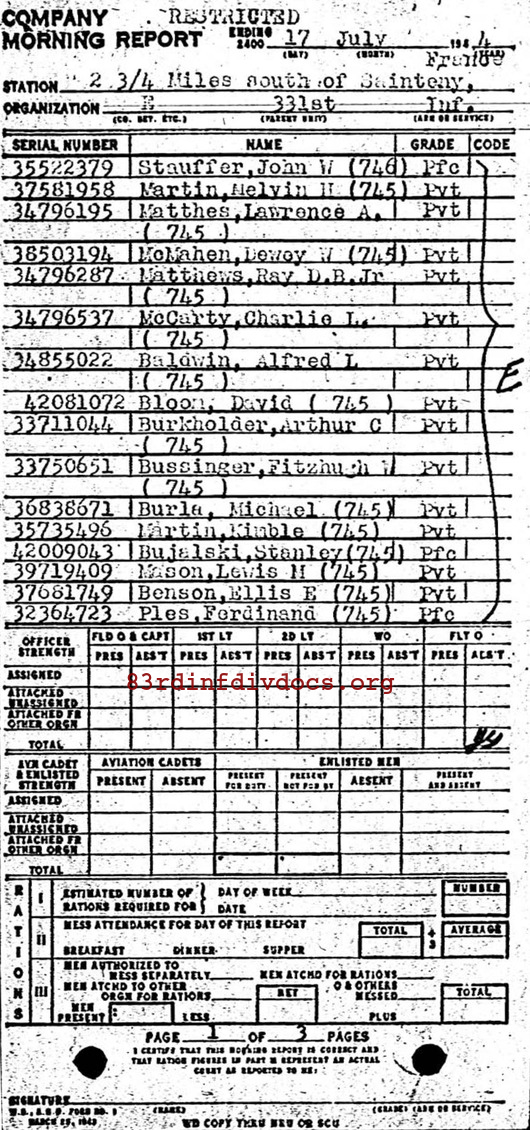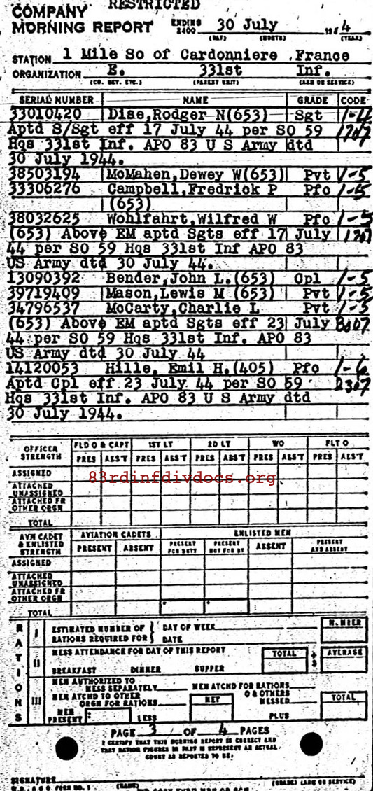 | The 331st Casualty Report (page 2, #5) for 1944 lists T/Sgt McMahen twice. Once as a S/Sgt (#5) and once as a T/Sgt (#45). Both listings place him as member of E Co. The morning reports confirm this. Technical Sergeant McMahen was a member of E Company. The morning report for July 17, 1944 on page 22 and 23 list him joining the unit from the 86th Replacement Battalion on July 18, 1944. Page 51, for July 30, 1944, lists his promotion to Staff Sergeant on July 23, 1944. |