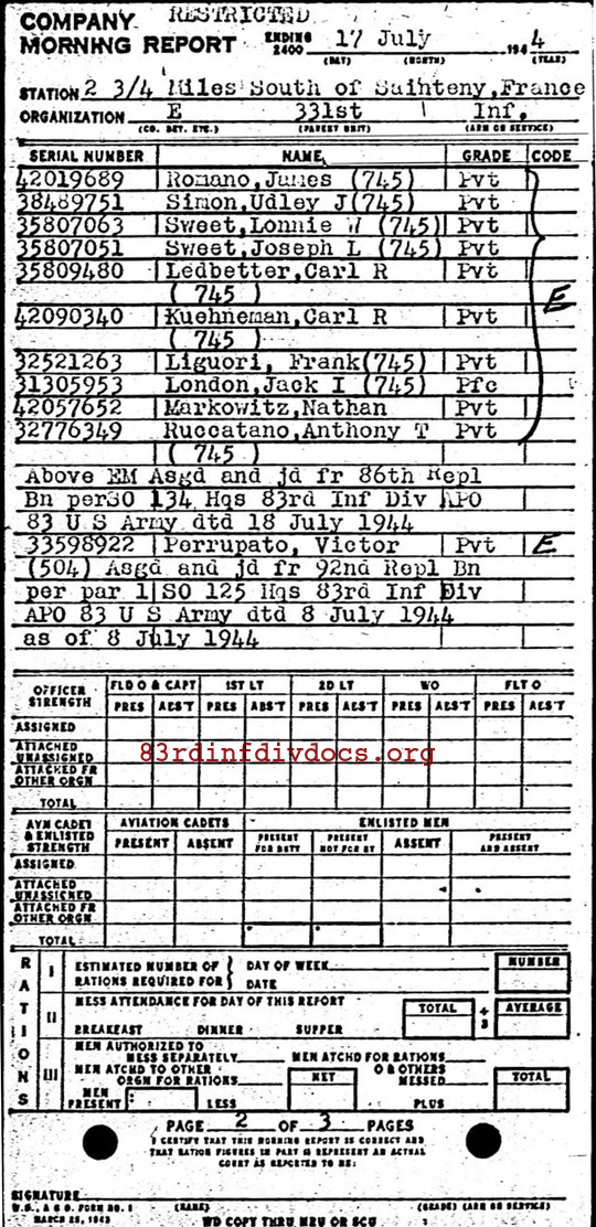 | 1944-07-17 | PVT | Assigned and joined from 86th Replacement Battalion as of July 18, 1944 | 745 | E / 331 | view page |