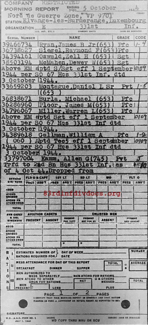 | 1944-10-05 | SGT | Promoted to Staff Sergeant, duty changed to Squad Leader (653) as of September 1, 1944 | E / 331 | view page | |