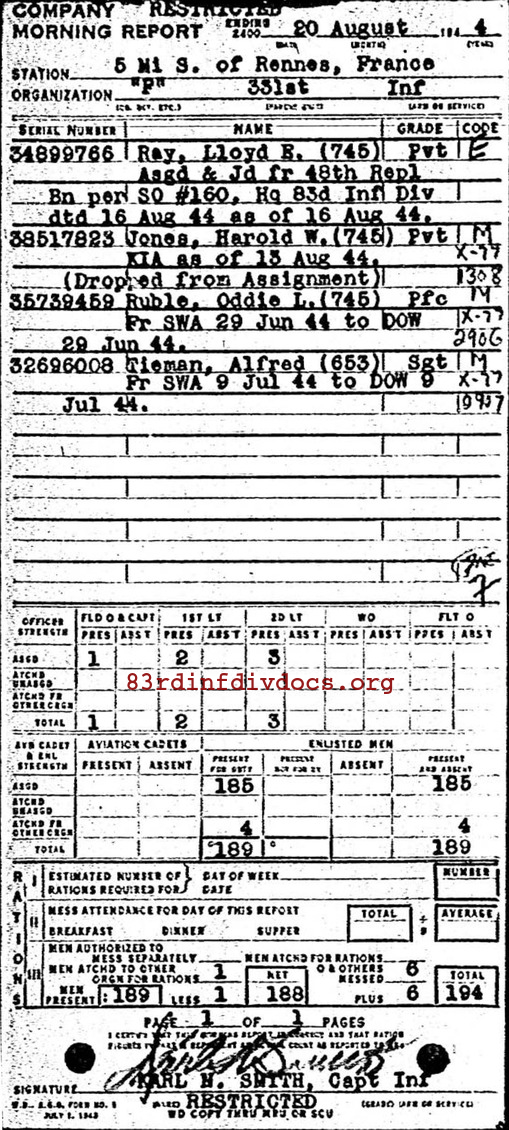 | 1944-08-20 | PVT | Killed in action on August 13, 1944 | 745 | F / 331 | view page |