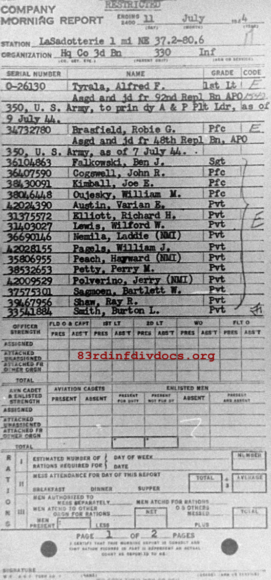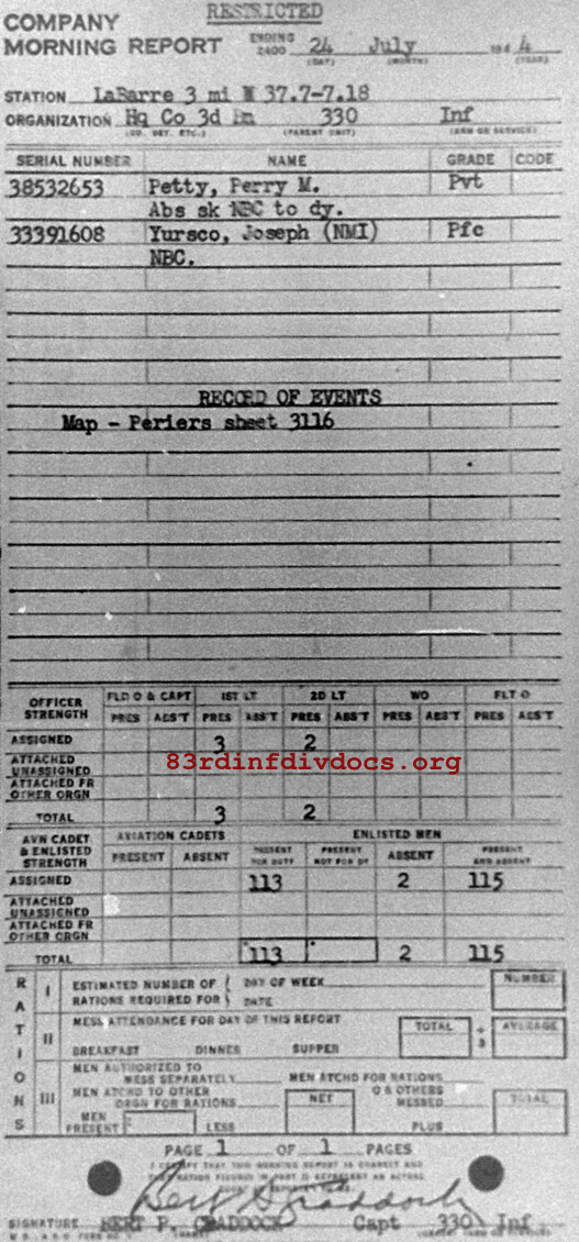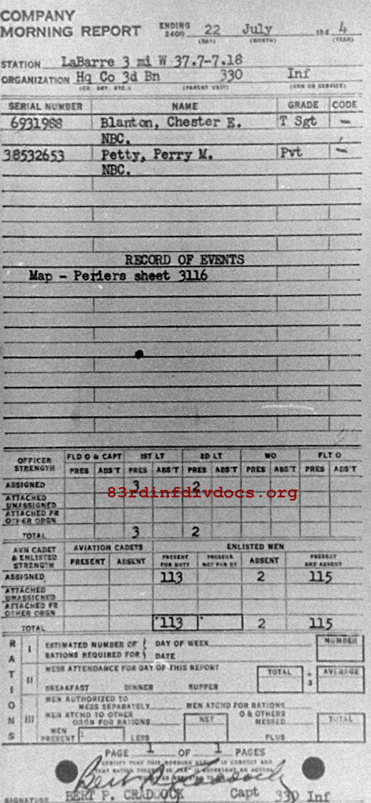| 1944-07-24 | PVT | Returned to duty from hospital (non battle casualty) on July 24, 1944 | HQCO3BN / 330 | view page | |