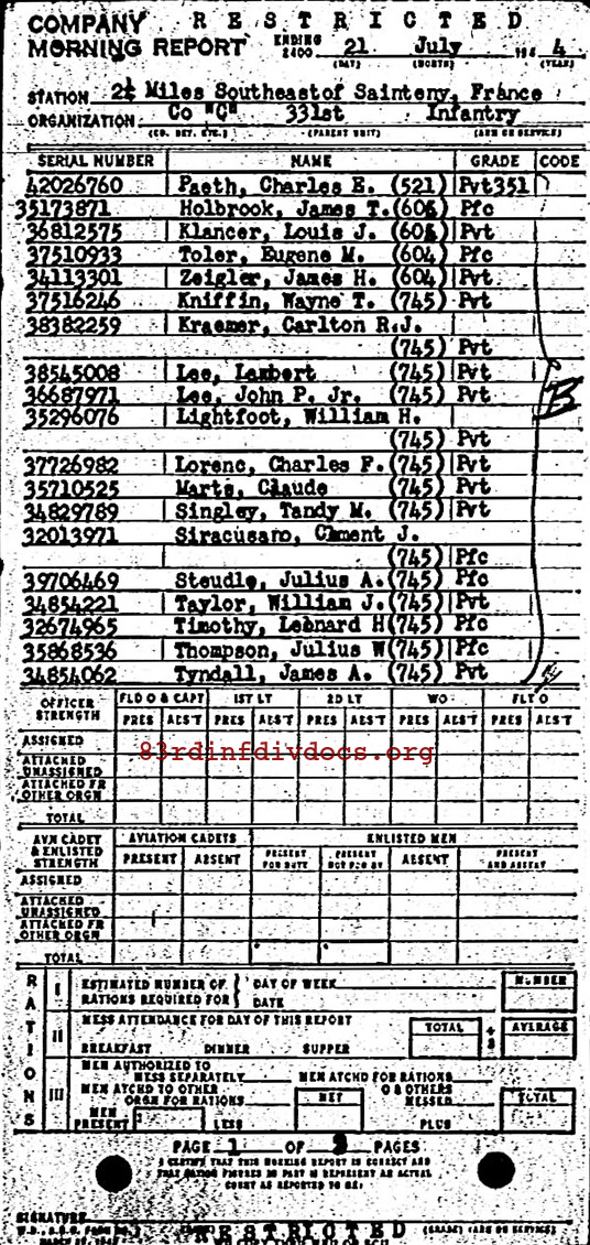 | 1944-07-21 | PVT | Assigned and joined from 48th Replacement Battalion as of July 21, 1944 | 745 | C / 331 | view page |