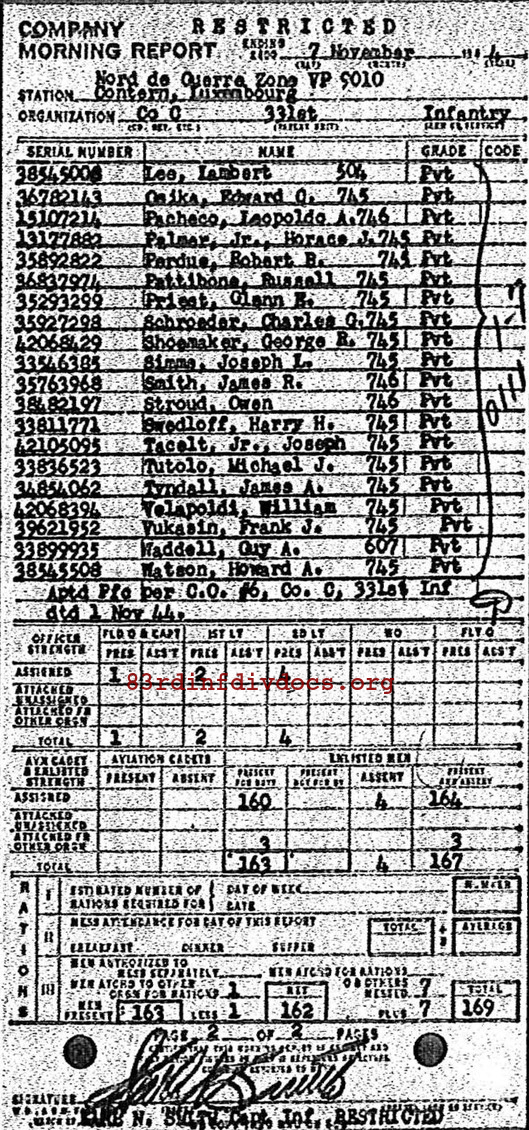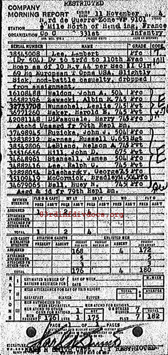 | Private First Class Lee was a member of C Company. The morning report for December 8, 1944 on page 9 lists him joining the unit from the 92nd Replacement Battalion on the same date. The morning report for HQ Company, 2nd Battalion, 330th also lists him assigned, and immediately reassigned on December 7, 1944. The pages can be seen below. |