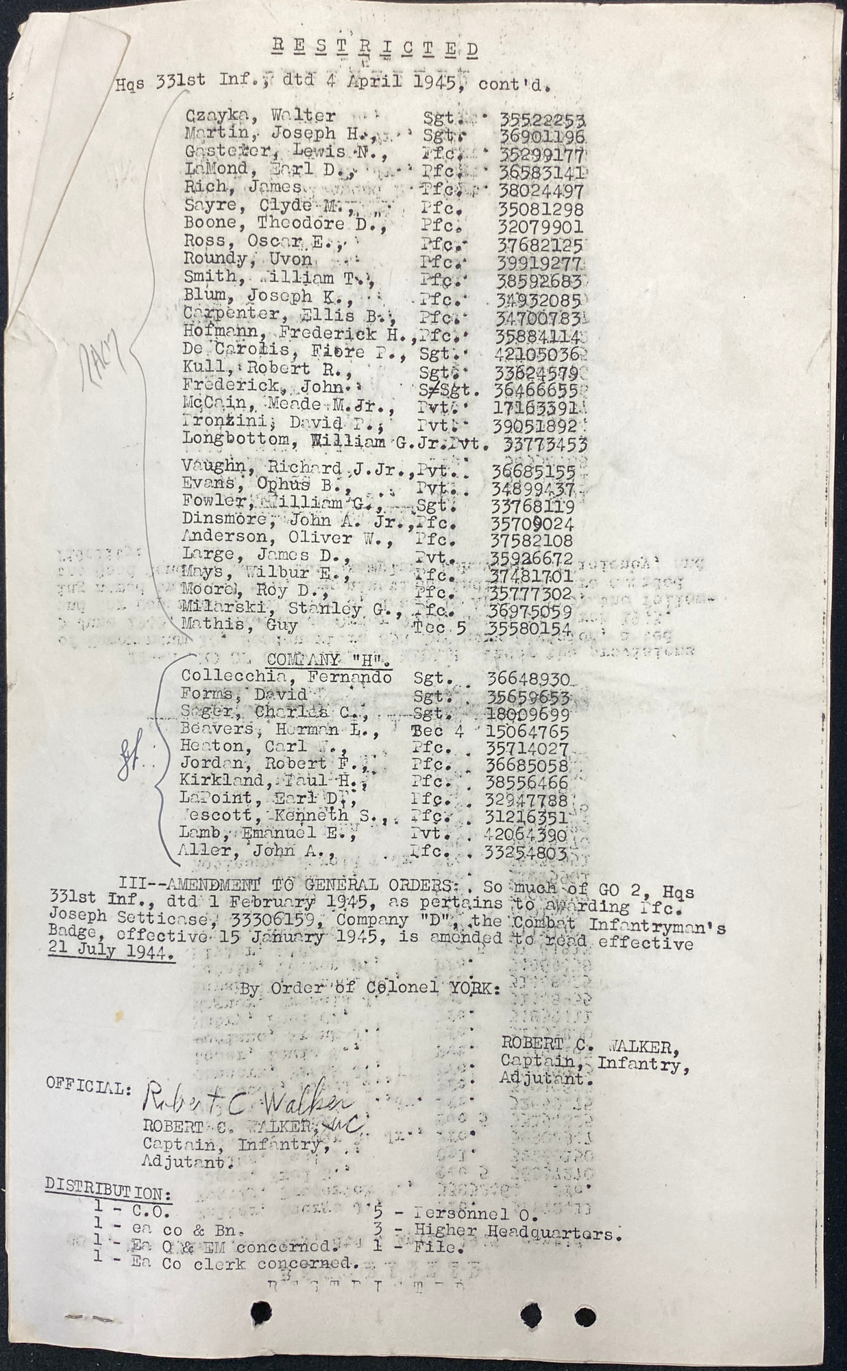 | Unit | H Company, 331st Infantry Regiment, 83rd Infantry Division |
