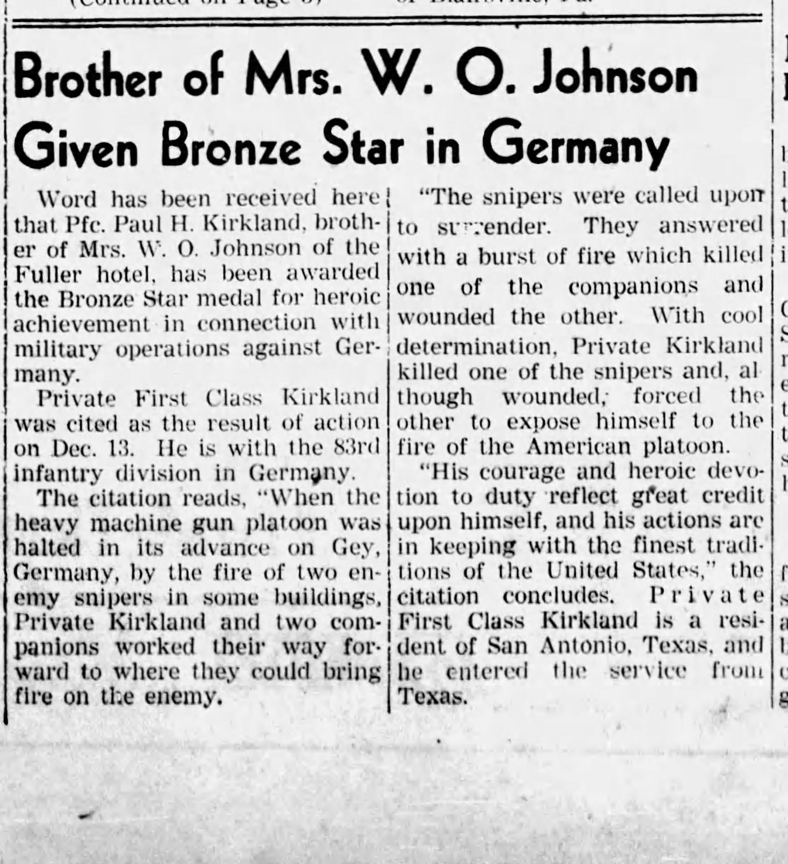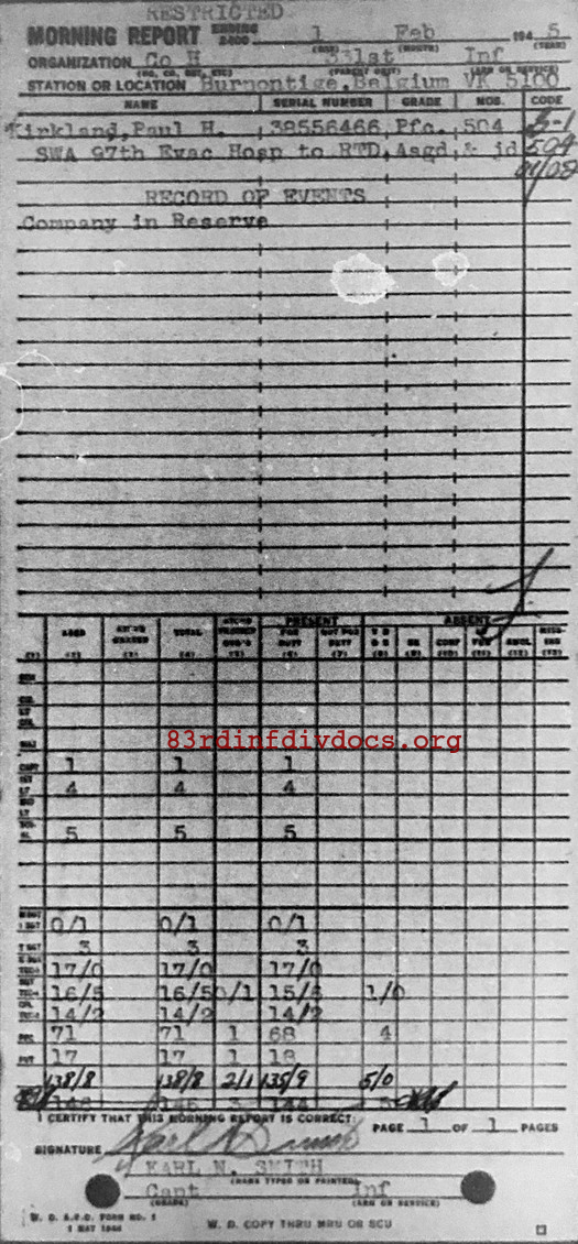 | 1944-12-15 | PFC | Severely wounded in action and transferred to 97th Evacuation Hospital on December 14, 1944 | 605 | H / 331 | view page |