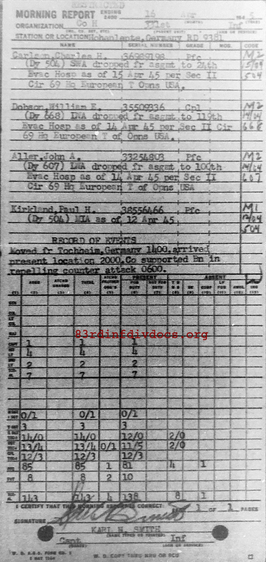 | 1945-04-21 | PFC | Killed in action on April 12, 1945, which corrects MR of April 16, 1945 | 504 | H / 331 | view page |