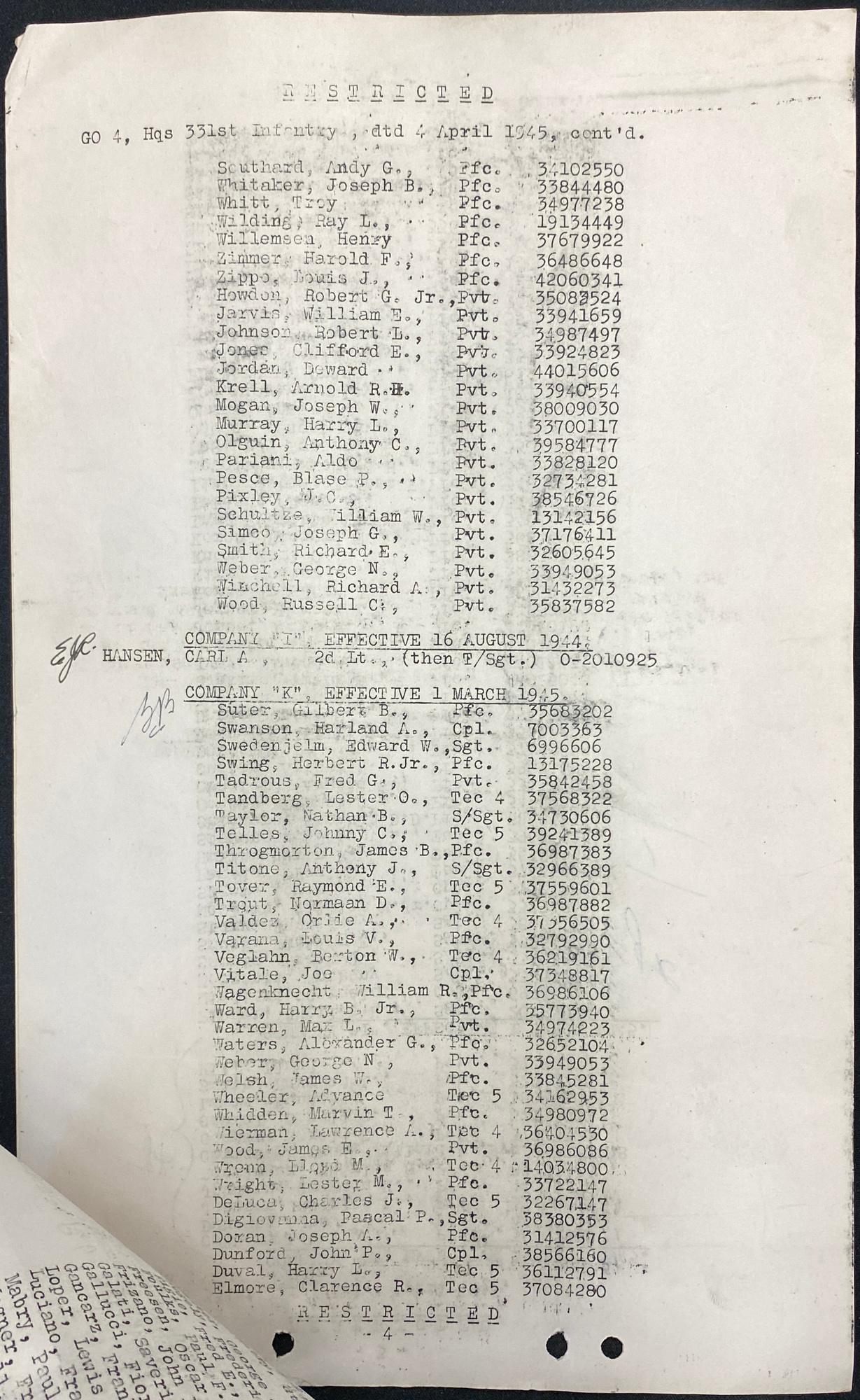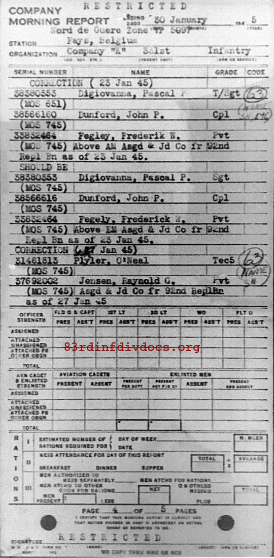| 1945-01-23 | CPL | Assigned and joined from 92nd Replacement Battalion as of January 23, 1945 | 745 | K / 331 | view page |