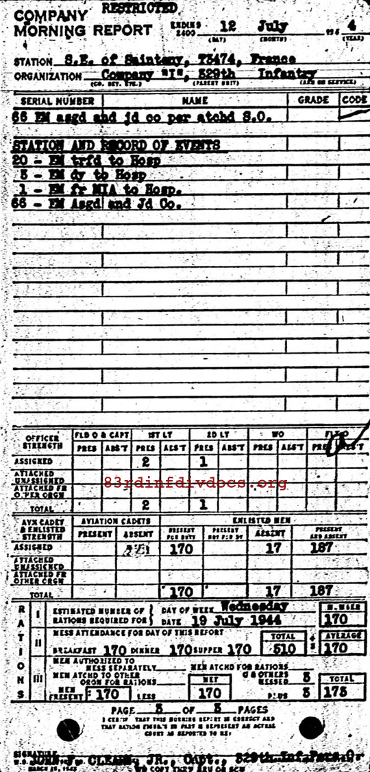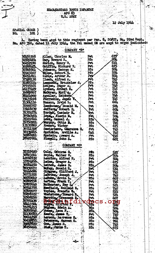 | 1944-07-12 | PVT | Assigned and joined from unknown unit as of July 12, 1944 | 521 | I / 329 | view page |
