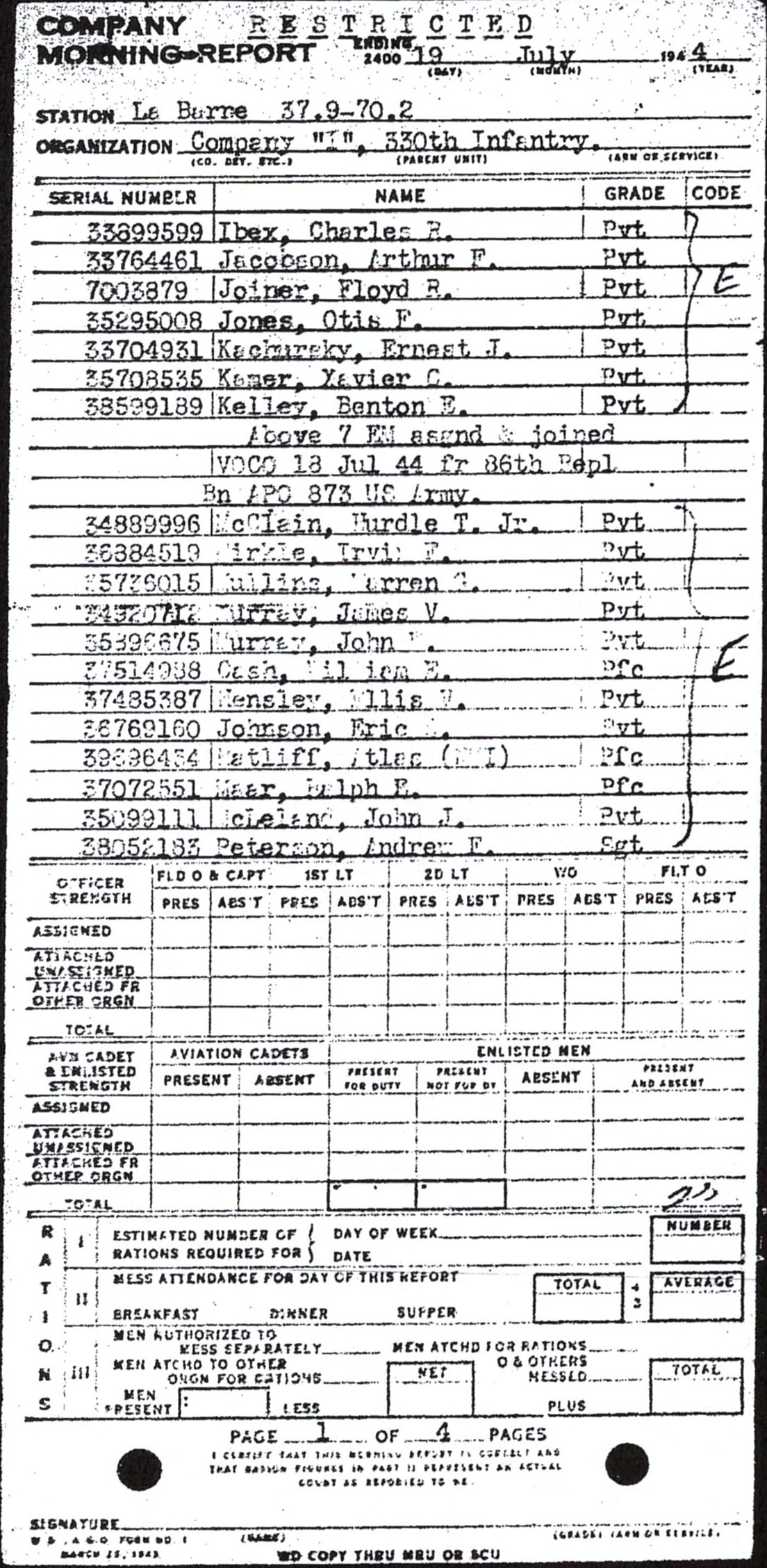 | 1944-07-19 | PVT | Assigned and joined from 86th Replacement Battalion as of July 18, 1944 | I / 330 | view page | |