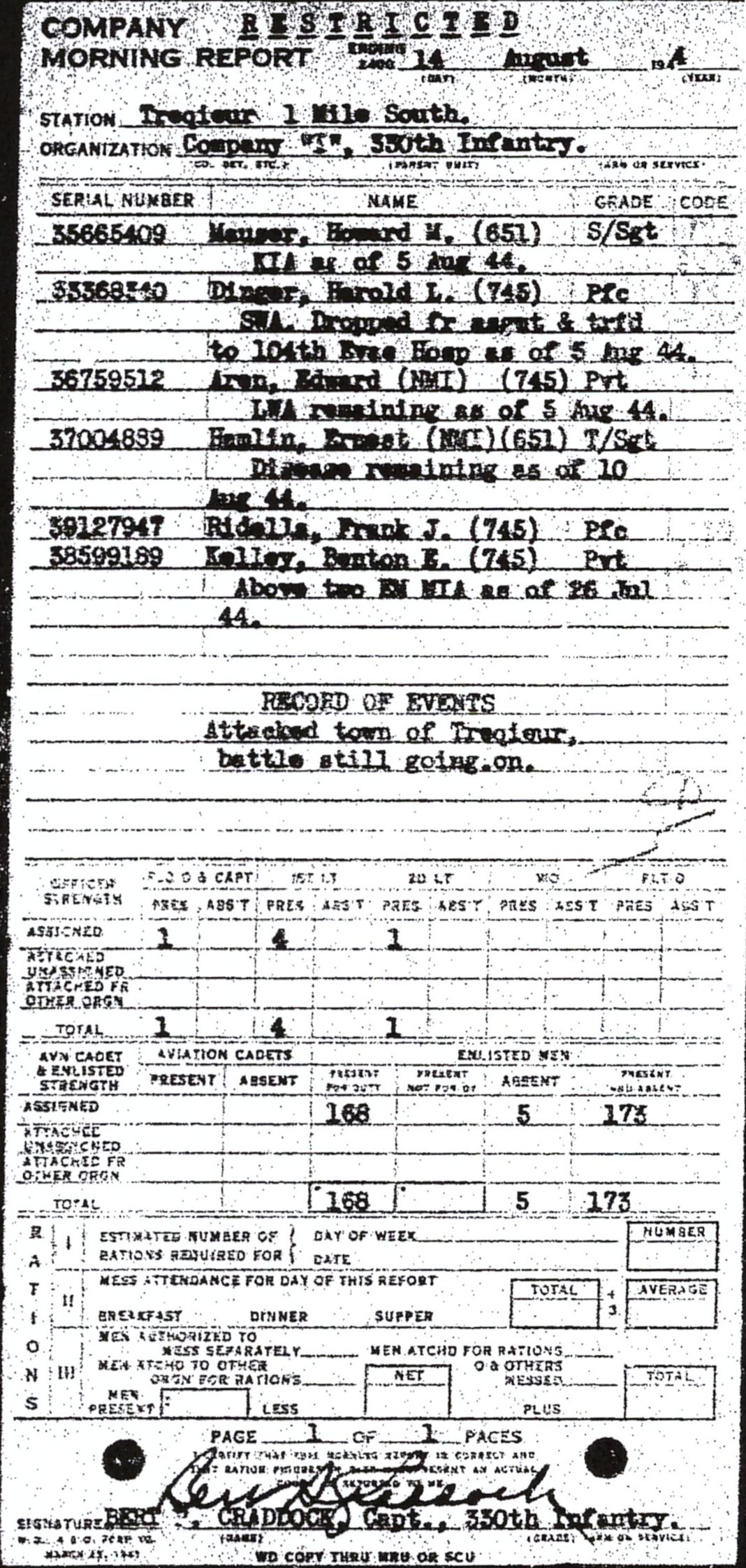 | 1944-08-14 | PVT | Missing in action as of July 26, 1944 | 745 | I / 330 | view page |