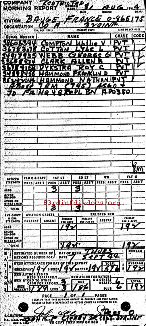 | Private Compton was a member of A Company. The morning report for August 31, 1944 on page 51 shows him joining A Company from the 48th Replacement Battalion. Page 51 can be seen here as well. Since we have no later documents we assume that Private Compton died while serving in A Company. |