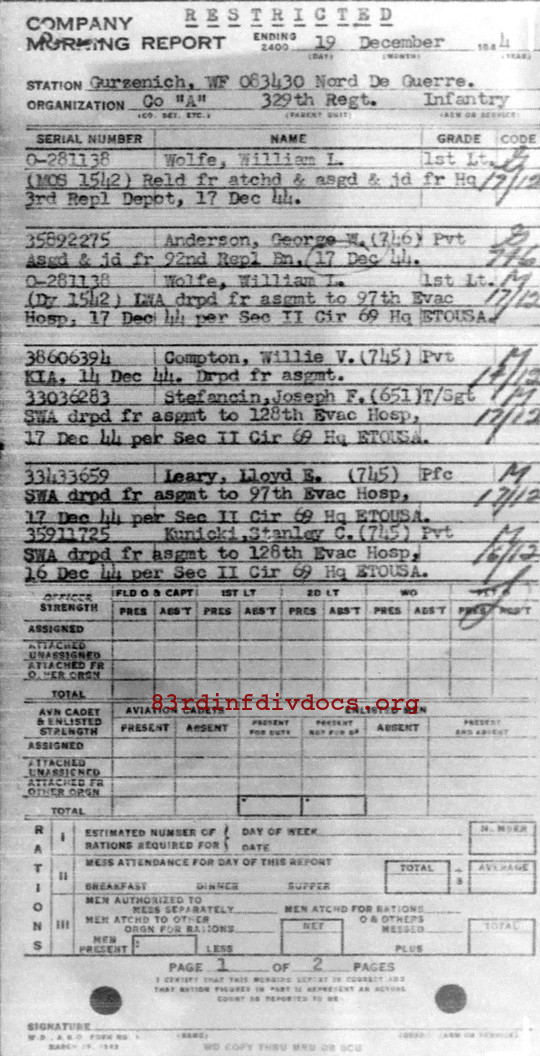 | Unit | A Company, 329th Infantry Regiment, 83rd Infantry Division |