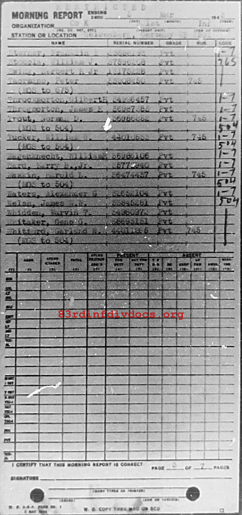 | 1945-04-16 | PFC | Missing in action as of April 13, 1945 | 745 | K / 331 | view page |