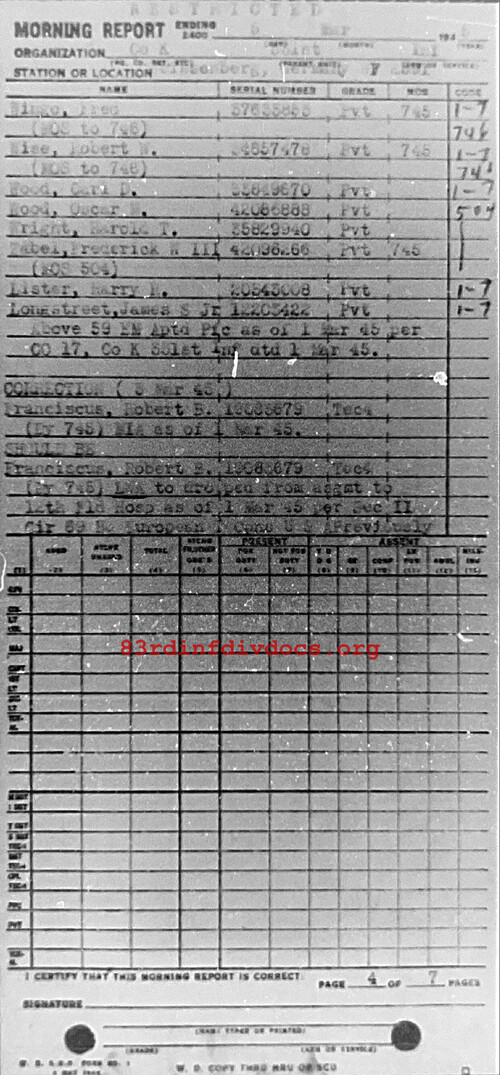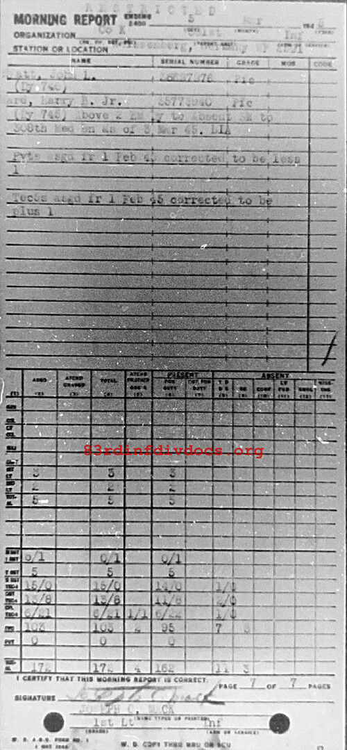 | 1945-03-05 | PFC | Lightly injured in action and duty to Clearing Station, 308th Medical Battalion on March 3, 1945 | 746 | K / 331 | view page |
