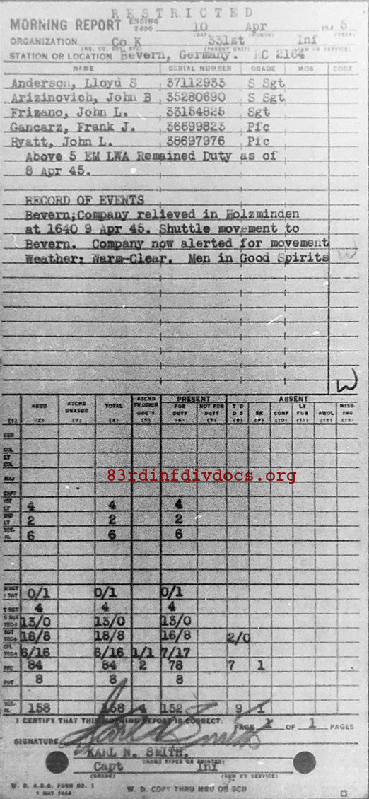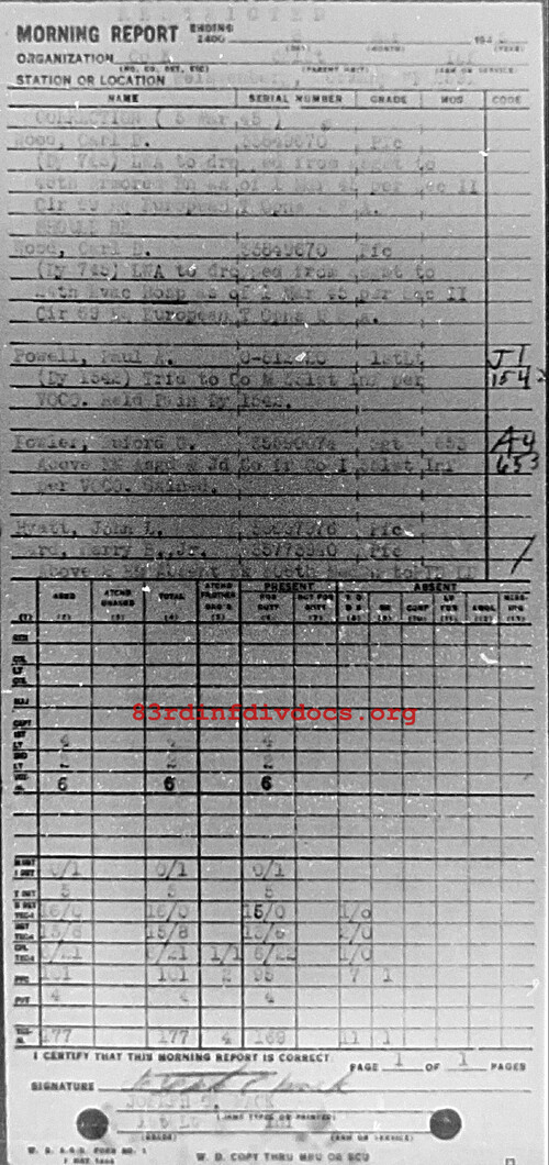 | 1945-03-08 | PFC | Returned to duty from Clearing Station, 308th Medical Battalion on March 8, 1945 | K / 331 | view page | |
