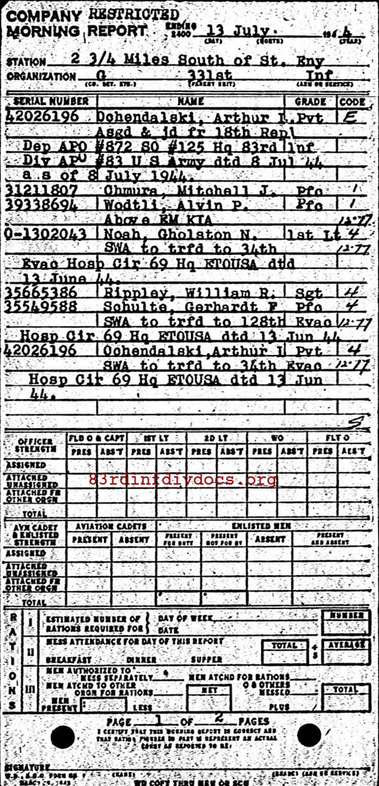 | The 331st Casualty Report (page 4, #137) for 1944 lists Pfc. Wodtli as member of G Co. |