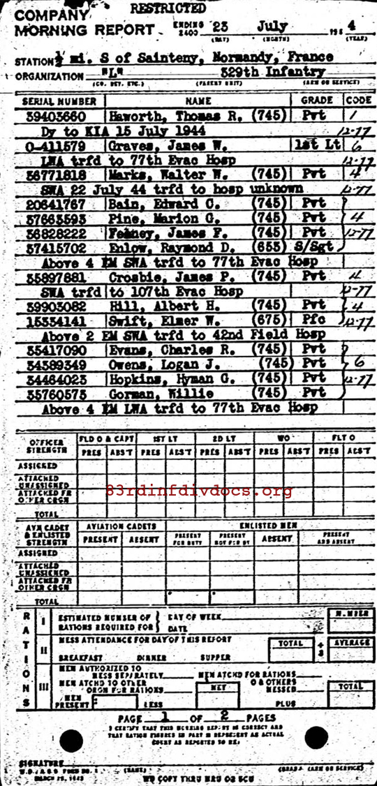 | The morning report for July 23, 1944 on page 73 lists a Haworth, Thomas R. The page can be seen below. |
