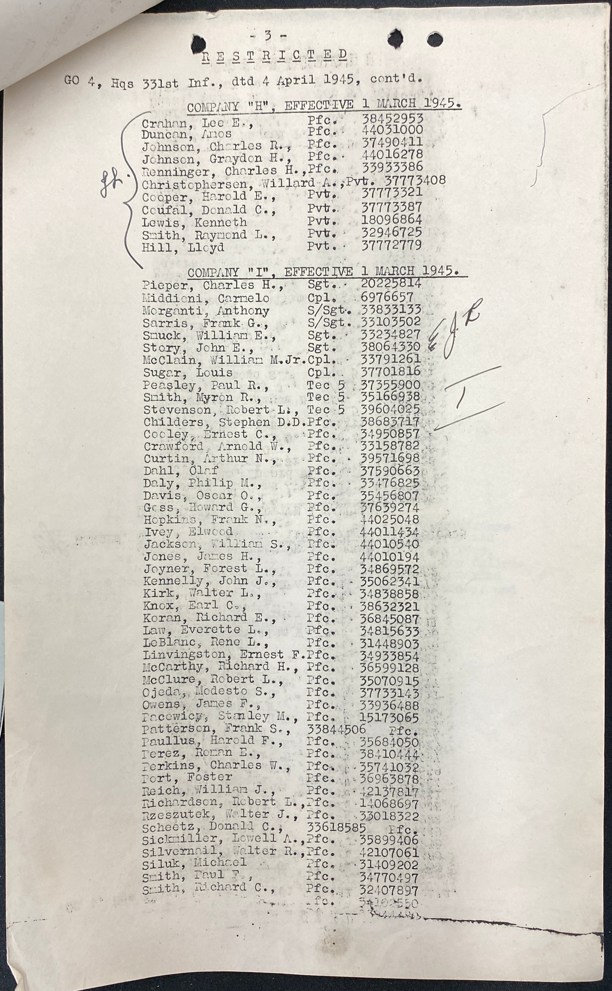 | Unit | I Company, 331st Infantry Regiment, 83rd Infantry Division |