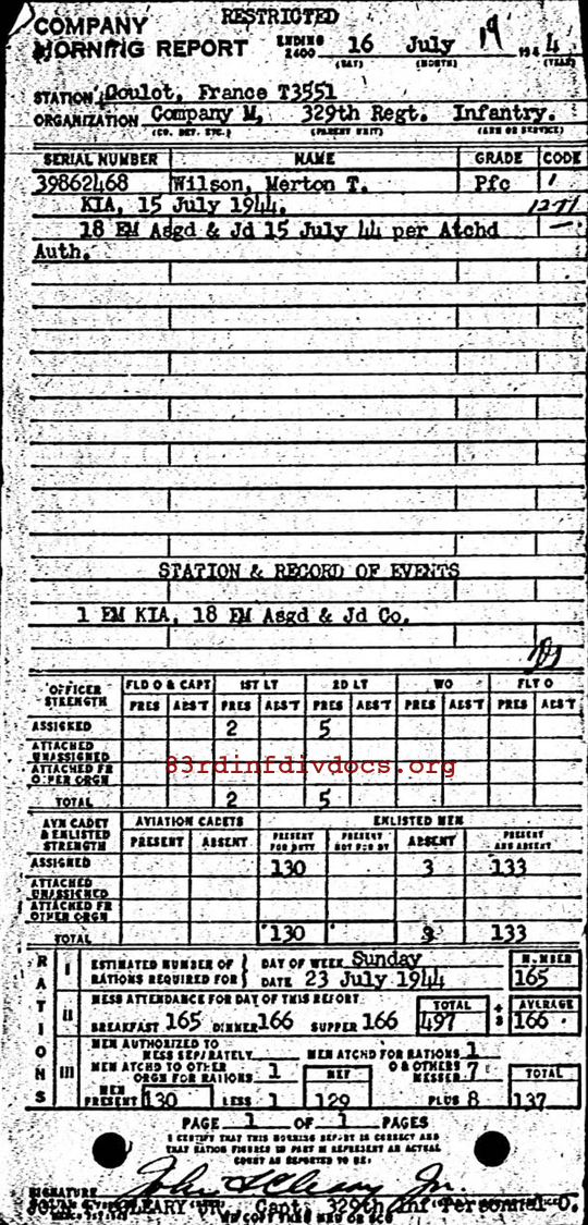 | Private First Class Wilson was a member of M Company. The morning report for July 16, 1944 on page 26 lists him as killed in action on July 15, 1944. The page can be seen below. |