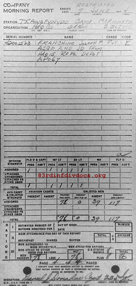 | 1944-06-07 | PVT | Assigned and joined from 15th Replacement Depot as of June 7, 1944 | HQCO2BN / 330 | view page | |