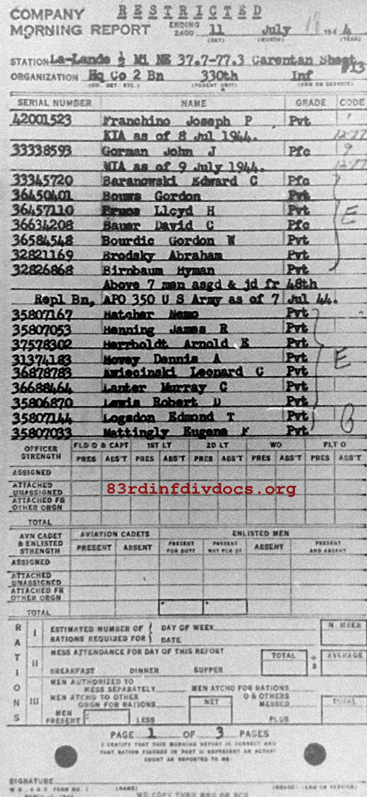 | 1944-07-11 | PVT | Killed in action on July 8, 1944 | HQCO2BN / 330 | view page | |