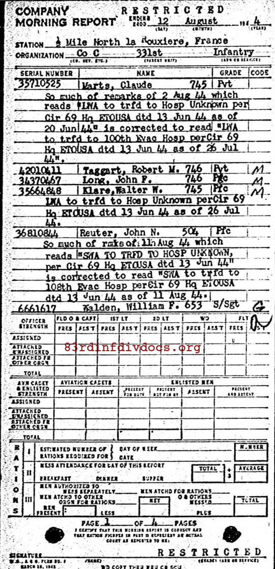 | 1944-10-05 | PVT | Lightly wounded in action and transferred to unknown hospital on July 4, 1944, which corrects MR of August 12, 1944 | 746 | C / 331 | view page |