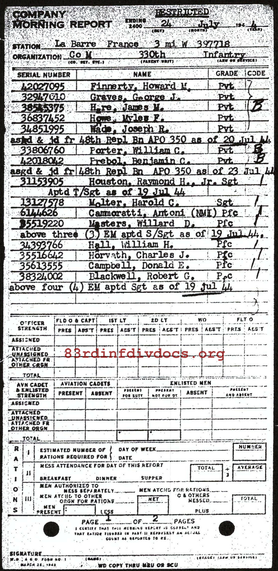 | 1944-07-24 | PVT | Assigned and joined from 48th Replacement Battalion as of July 23, 1944 | M / 330 | view page | |