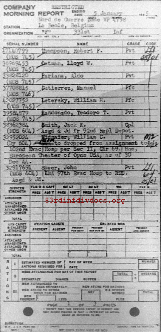 | 1945-01-05 | PFC | Assigned and joined from 92nd Replacement Depot as of January 5, 1945 | 745 | F / 331 | view page |