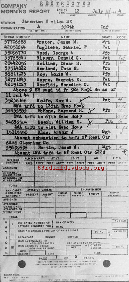 | 1944-07-16 | PVT | Killed in action on July 16, 1944 | A / 330 | view page | |