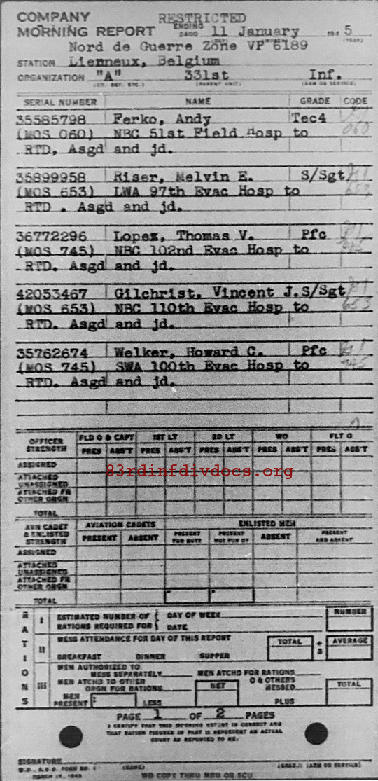 | 1945-01-11 | SSGT | Assigned and joined from 110th Evacuation Hospital as of January 11, 1945 | 653 | A / 331 | view page |