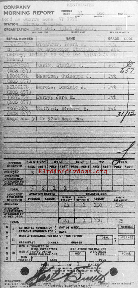 | 1944-12-31 | PVT | Assigned and joined from 97th Replacement Battalion as of December 31, 1944 | 657 | MEDDET / 331 | view page |