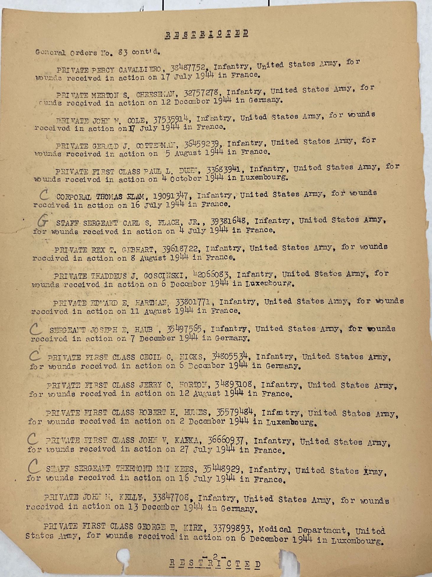 | 1944-12-21 | PVT | Killed in action on December 15, 1944 | 745 | K / 329 | view page |