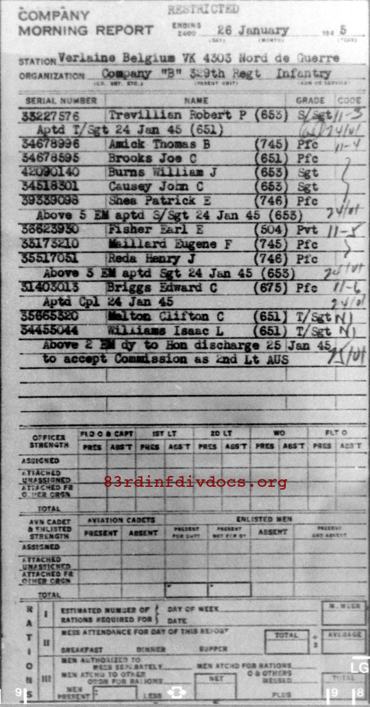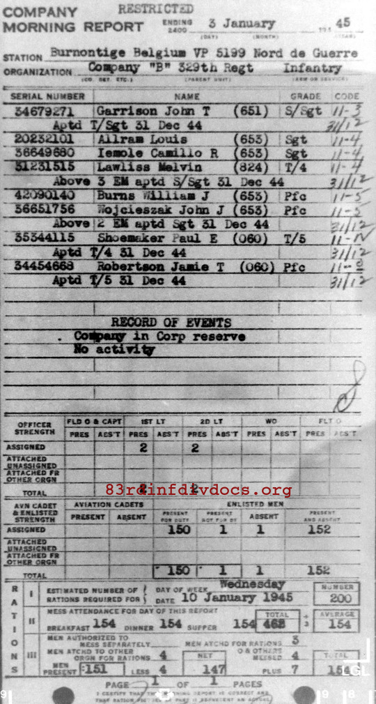 | 1945-01-03 | PFC | Promoted to Sergeant, duty changed to Squad Leader (653) as of December 31, 1944 | B / 329 | view page | |