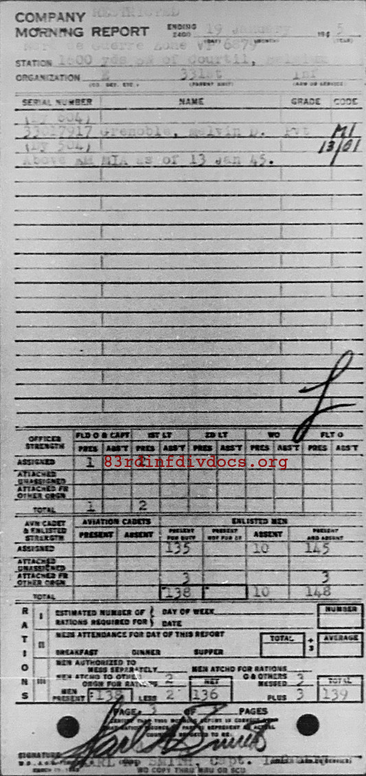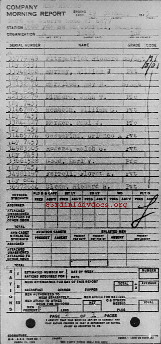 | Tribute to soldier Private First Class John T. Di Mauro, ASN 42132279, 2nd Platoon, E Company, 331st Regiment, 83rd Division written by Tom DePiano. Originally from 306 Haven Avenue, New York (Bronx), New York. Killed in Action 13 January 1945, forest outside Bihain, Belgium – 19 years old This brief story was told to me years ago by my father-in-law, Private First Class Fiore “Frank” DeCarolis, who was a member of the same unit as that of John Di Mauro. They both were assigned to E Company on 2 January 1945 along with many other new replacements according to researched Company E Morning Report. On 13 January 45, the Company’s position was hit by a severe German artillery barrage while occupying their positions in the densely wooded Ardennes forest. Company After Action Reports (AAR) listed this area as outside of Bihain, Belgium but DeCarolis said he had no idea of their map location. That was the plight of the infantryman – just keep moving without knowing where you are or where you were. He stated that the barrage produced a lot of tree bursts which were just as deadly as the shrapnel in causing wounds or death and was terrifying. The AAR entry for 13 Jan 45 referred to severe artillery barrages in the area of operations. A sterile comment considering the AAR listed 127 casualties for the company that day. After the barrage, DeCarolis leaned his M1 Garand rifle against a tree for unexplained reasons. The rifle would have been a new one as he was a new replacement recently having completed training. I never thought to ask what was he doing that caused him to leave the rifle – tending to wounded? We will never know. He said when he came back, his M1 rifle had been replaced with a rusty, battered and inoperable rifle. Obviously the soldier who did this was a veteran of previous time in the field under harsh conditions and did not properly care for his rifle. Realizing the rifle was useless, DeCarolis took possession of another M1 rifle – the one that had been issued to Private First Class Di Mauro. He said Di Mauro had been killed by the artillery barrage and had suffered a severe leg wound which ultimately led to his death. My father-in-law apparently was deeply moved by this experience and never forgot it or Private First Class Di Mauro. Being a 19 year old soldier, newly assigned and placed in to the harshest of field conditions in the Battle of the Bulge, and seeing your fellow soldier, a 19 year old replacement just like you, die with only 11 days in combat is something no one would forget. As far as I know, DeCarolis carried that M1 garand through the end of the war. As part of research on his father in law Tom also researched the morning reports for E Company, 331st. These confirm that Private First Class. Di Mauro joined the unit on January 2, 1945, from the 92nd Replacement Battalion. The pages can be seen below. |