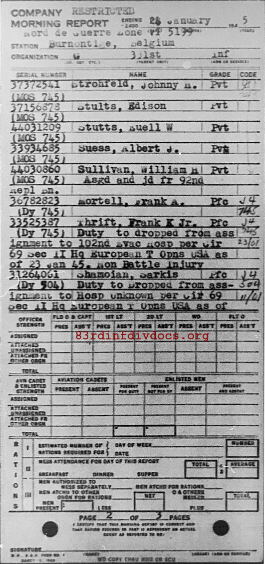 | 1945-01-24 | PVT | Assigned and joined from 92nd Replacement Battalion as of January 24, 1945 | 745 | G / 331 | view page |
