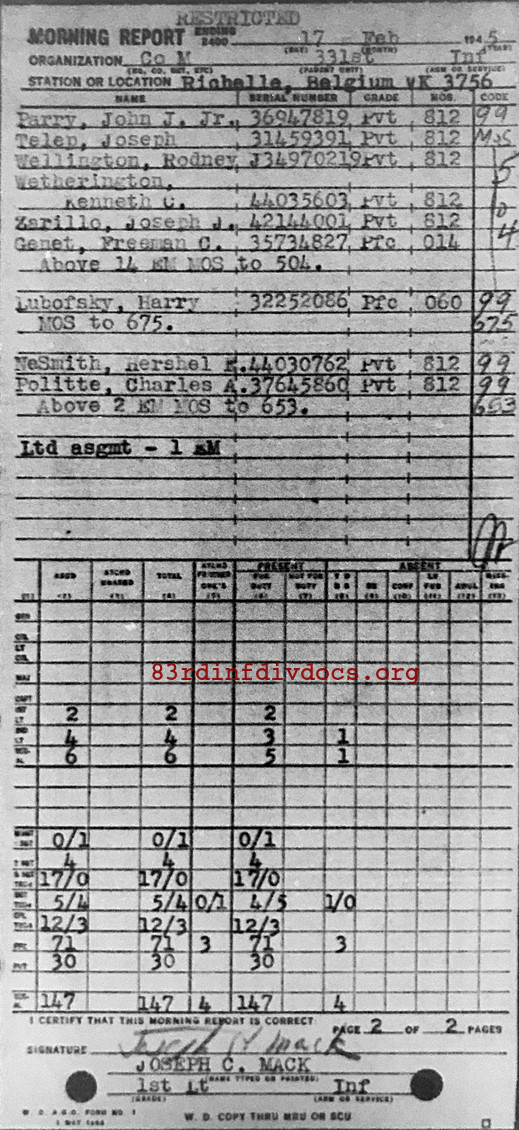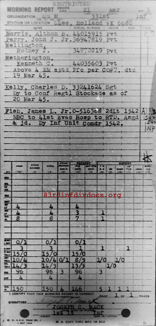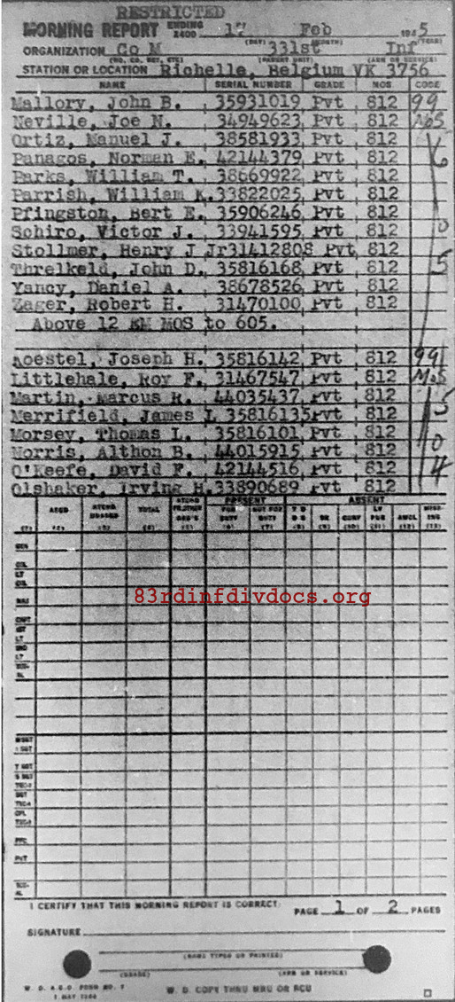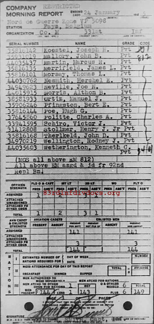 | 1945-01-24 | PVT | Assigned and joined from 92nd Replacement Battalion as of January 24, 1945 | 812 | M / 331 | view page |