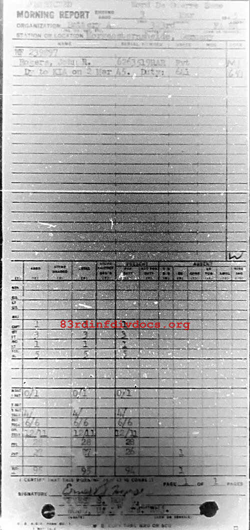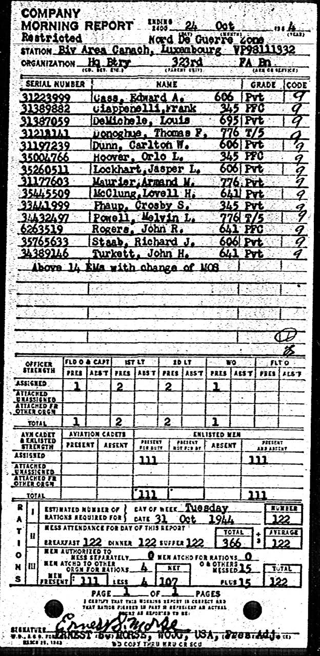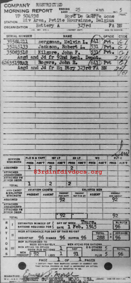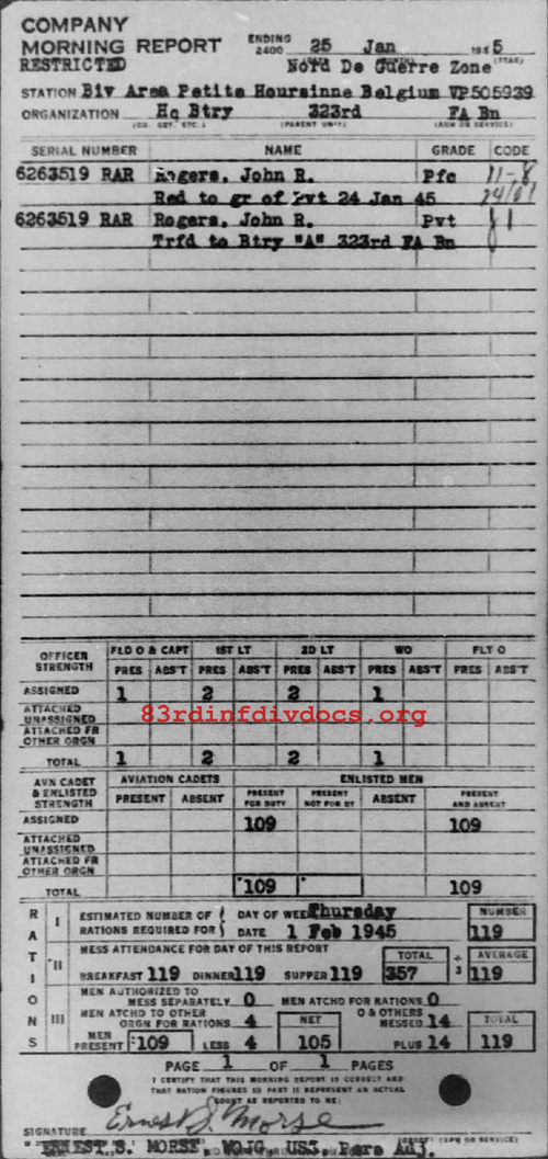 Assigned and joined from HQ Battery, 323rd Field Artillery Battalion as of January 25, 1945 |
