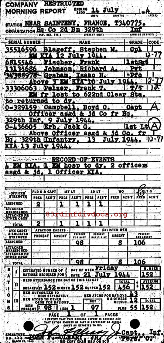 | 1944-07-14 | 1SGT | Killed in action on July 10, 1944 | HQCO2BN / 329 | view page | |
