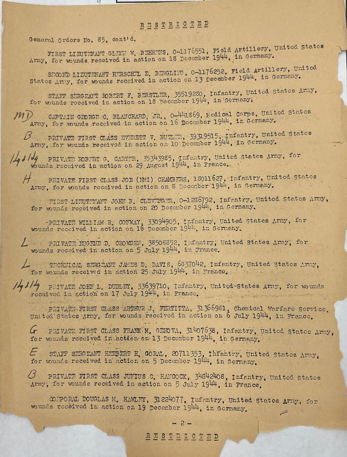| Listed in 330th Infantry Regiment Casualties and Awards as wounded in action as a Staff Sergeant in 330. | 37 | ||||