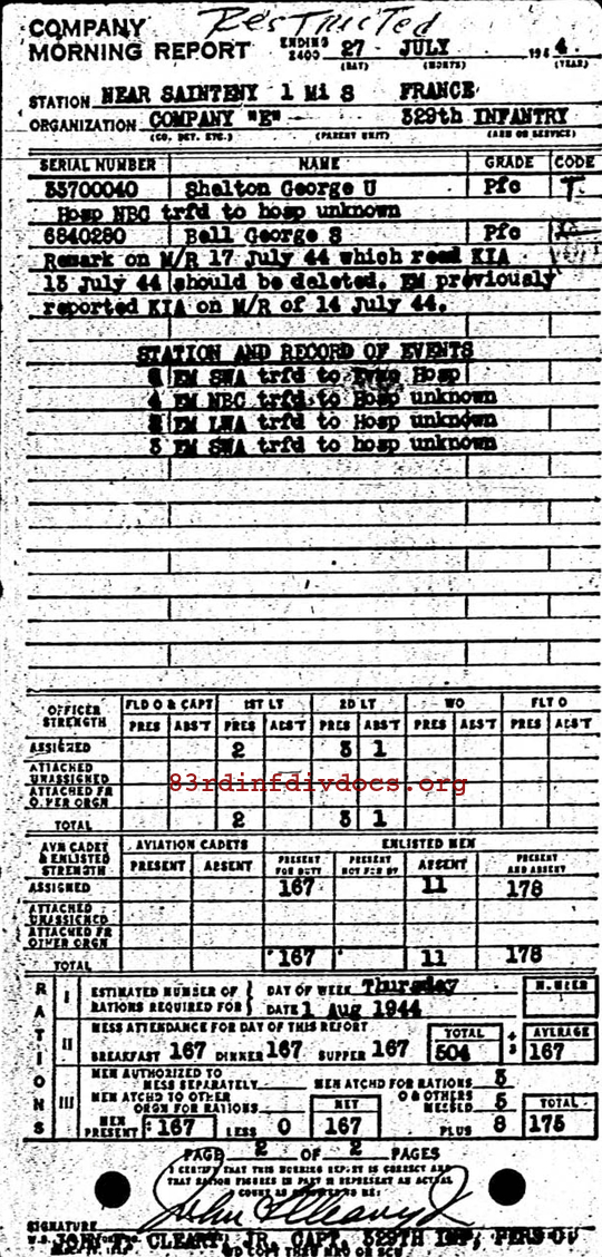 | Private First Class Bell was a member of E Company. The morning report for Jul 14, 1944 on page 56 lists him as killed in action on July 13, 1944. Page 64 again lists him as killed in action on July 13, 1944. Page 96 redacts the entry on page 64 as it was already mentioned on the MR for July 14, 1944. Page 56, 64 and 96 can be seen here. |