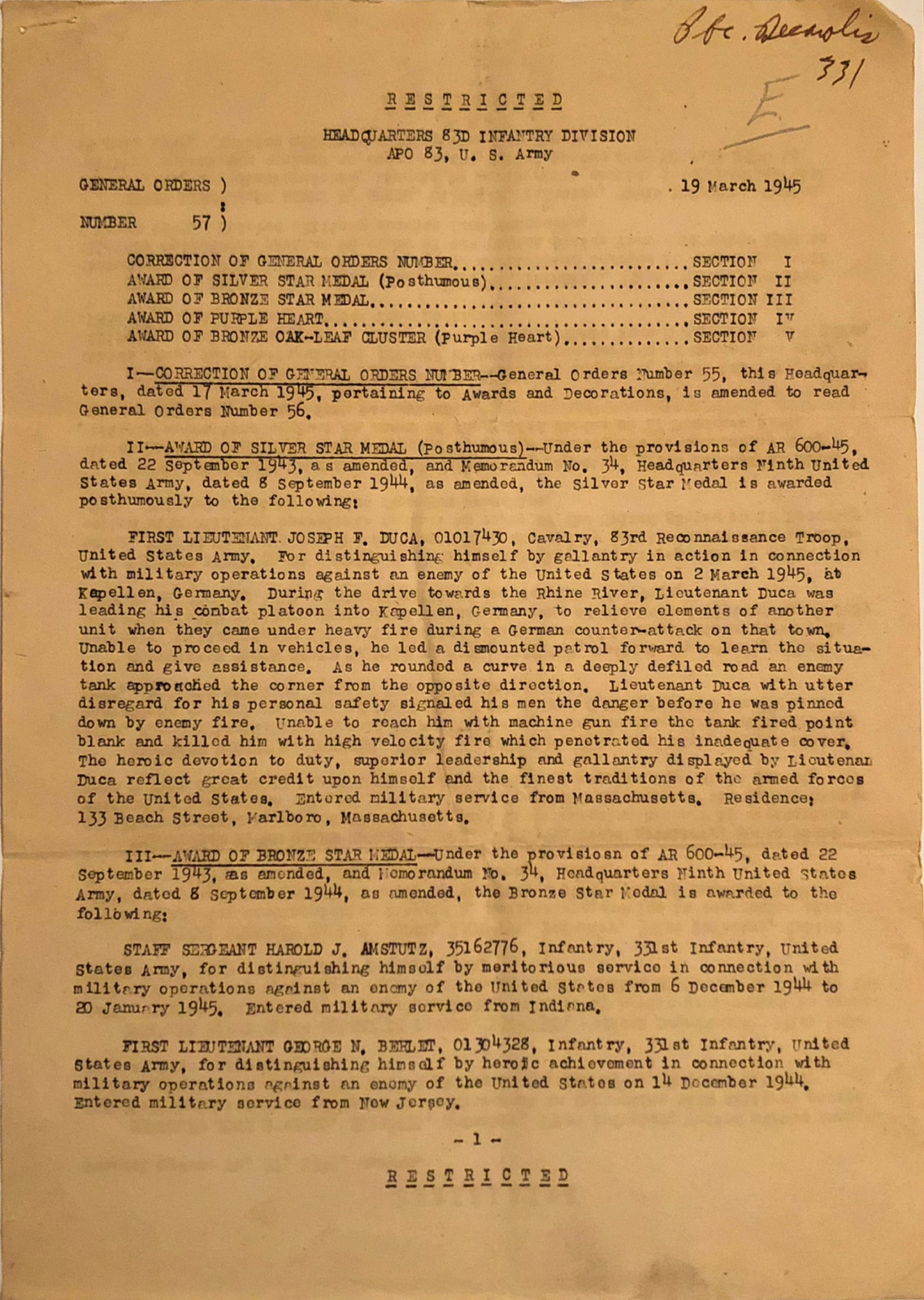 For distinguishing himself by gallantry in action in connection with military operations against an enemy of the United States on 2 March 1945, at Kapellen, Germany. During the drive into Kapellen, Germany, to relieve elements of another unit when they came under heavy fire during a German counter-attack on that town. Unable to proceed in vehicles, he led a dismounted patrol forward to learn the situation and give assistance. As he rounded a curve in a deeply defiled road an enemy tank approached the corner from the opposite direction. Lieutenant Duca with utter disregard for his personal safety signaled his men the danger before he was pinned down by enemy fire. Unable to reach him with machine gun fire the tank fired point blank and killed kim with high velocity fire which penetrated his inadequate cover. The heroic devotion to duty, superior leadership and gallantry displayed by Lieutenant Duca reflect great credit upon himself and the finest traditions of the armed forces of the United States. |