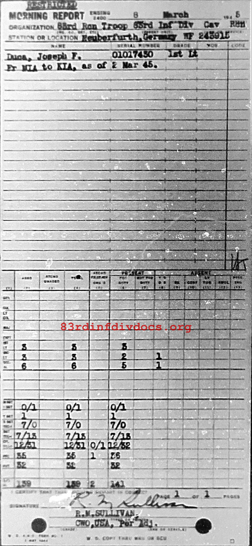 | 1945-03-08 | 1LT | Killed in action on March 2, 1945 | 1620 | 83RCNTRP | view page |