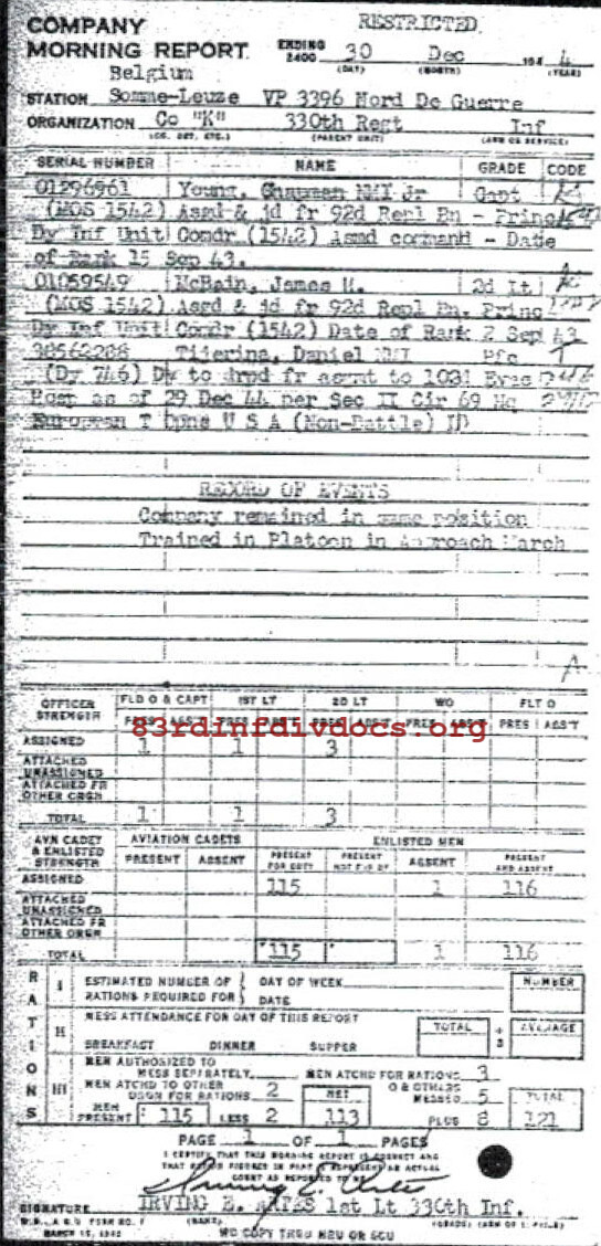 | Second Lieutenant McBain was a member of K Company. The morning report for December 30, 1944 on page 44 lists him joining the unit from the 92nd Replacement Battalion. The page can be seen below. |