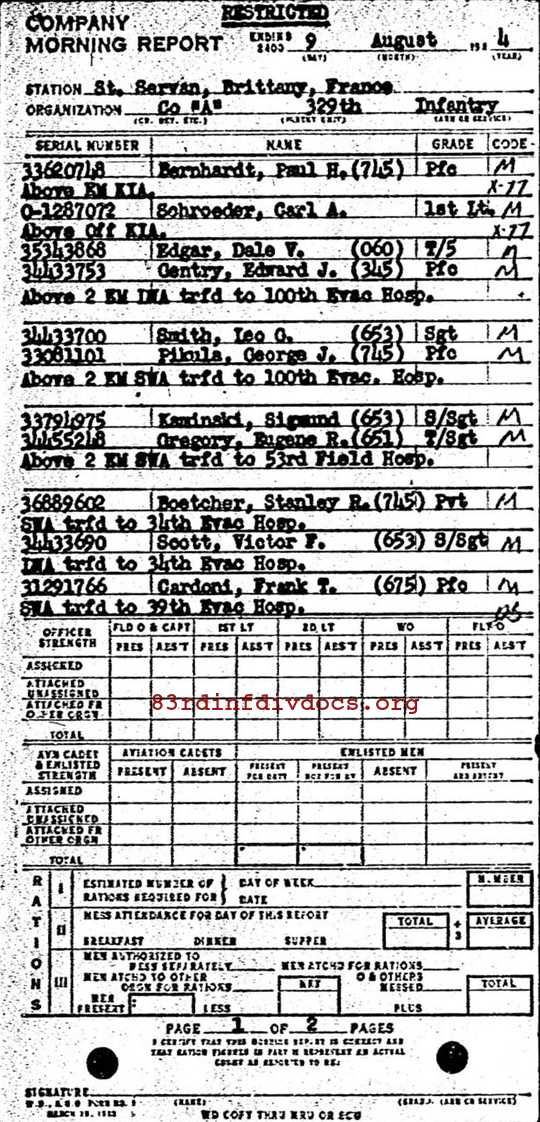 | First Lieutenant Schroeder was a member of A Company. The morning report for July 22, 1944 on page 58 show him assuming command of the company and this is redacted on page 61. Page 58 and 61 can be seen here as well. Page 11 in the morning report for August 9, 1944 lists his him as killed in action. Page 11 can be seen here as well. |