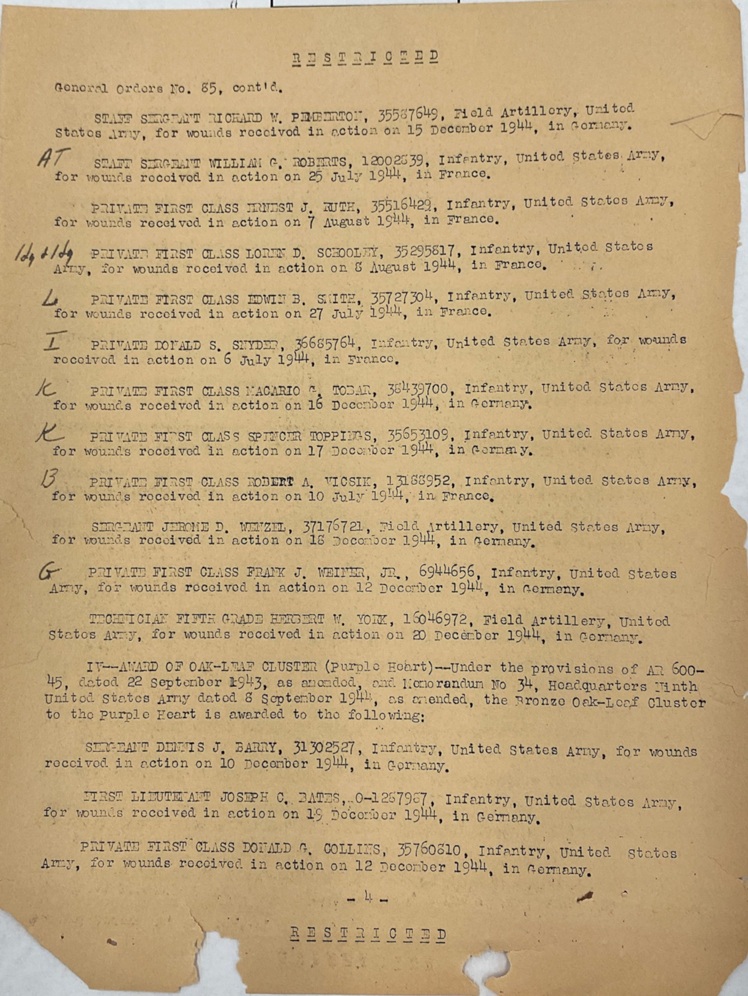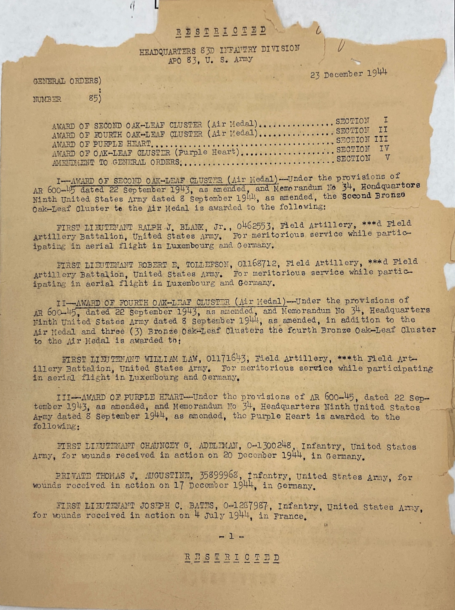 | Listed in 331st Infantry Regiment After Action Report, February 1945: Awarded Bronze Star Medal for distinguishing themselves by heroic achievement, meritorious achievement or meritorious service. Issuing General Order unknown, see temporary entry for GO 83/1945/#0 above. as a First Lieutenant in 331 | 18 | ||||