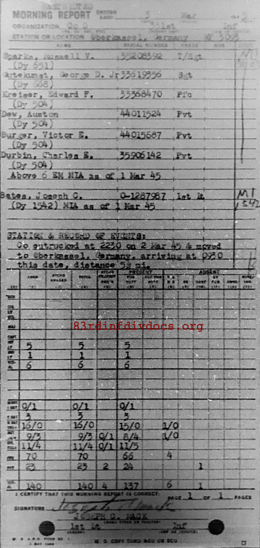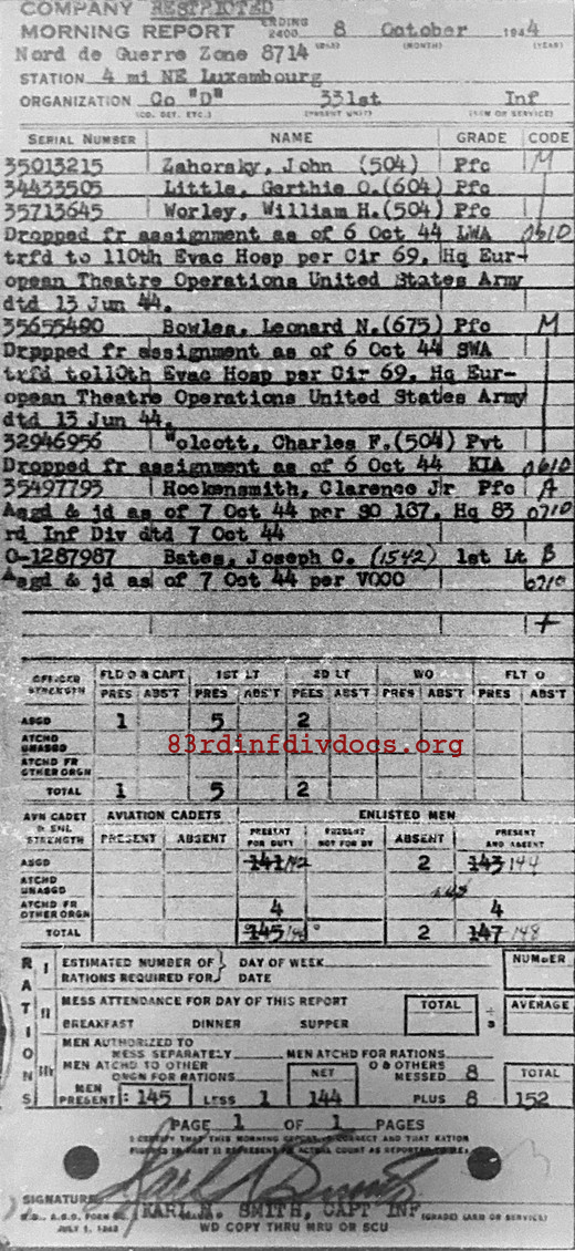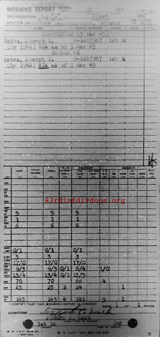 | According to the memoirs of Frank Monan, Co. A 331st, 1st. Lt. Joseph C Bates was original cadre for Company A, 331st and severly wounded on July 5th, 1944. This is confirmed by the morning reports. First Lieutenant Bates was a member of A Company. The morning report for June 9, 1944, shows 1LT Bates joining A Company per June 7, 1944 while the unit was still in Tarporley, Chesire, UK. The morning report for July 5, 1944 on page 6 lists him as severely wounded in action and transferred to the 128th Evacuation Hospital. The pages can be seen below. Since have no later documents we assume that First Lieutenant Bates died while serving in A Company. |