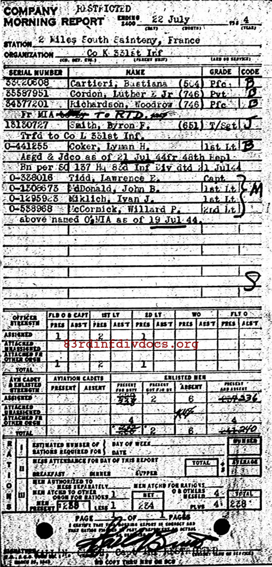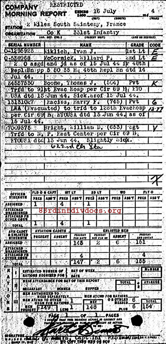 Bill Cass is working on a book about a company commander/S-3 in the 398th Infantry Regiment, 100th Infantry Division. First Lt. Ivan J. Miklich was a platoon leader in K Company when it was led by the subject of the biography he is working on. Bill provided me with a picture out of the 100th Infantry Division 1944 yearbook. Miklich was one of many junior officers transferred out of the 100th to other divisions as part of the D-Day build-up. |