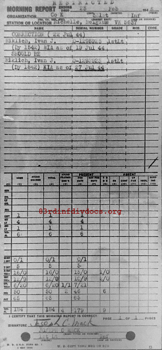 First Lieutenant Ivan J. Miklich served in the 331st Infantry Regiment, 83rd Infantry Division. He grew up in the Collinwood section of Cleveland, OH, the son of Slovenian immigrants. Five of the six Miklich boys served in World War II and they were hardly teenagers at the time: Edward, the youngest, was 27 years old, while Frank, the oldest, was 37. Before the war, Ivan was the only son to attend college, enrolling at Bowling Green State University to study law, where he met his wife, Norma. On July 19, 1944, while trying to cross a causeway over a swamp in Normandy, Ivan was captured and taken prisoner by the Germany army. According to his sister Rose, he was then put on a troop train headed back to Germany. American aircraft assumed the train was filled with retreating German troops so they bombed it, killing Ivan and several other American POWs. Ivan is buried today at the Netherlands American Cemetery, side by side with his brother Lou Miklich, who served in the 102nd Division. Thanks to Rose Miklich for sharing her stories and memories of her brothers with Kevin M Callahan. From his book, "Brothers in Arms: Remembering Brothers Buried Side by Side in American World War II Cemeteries."